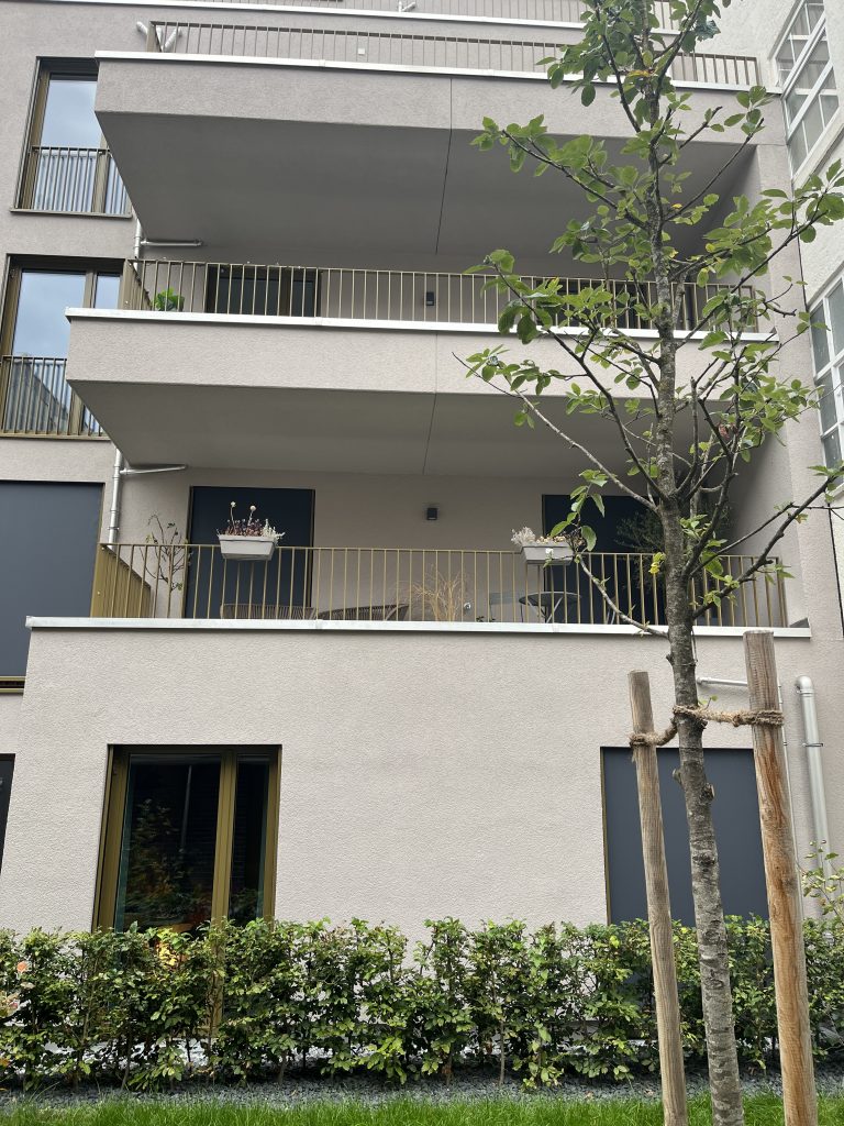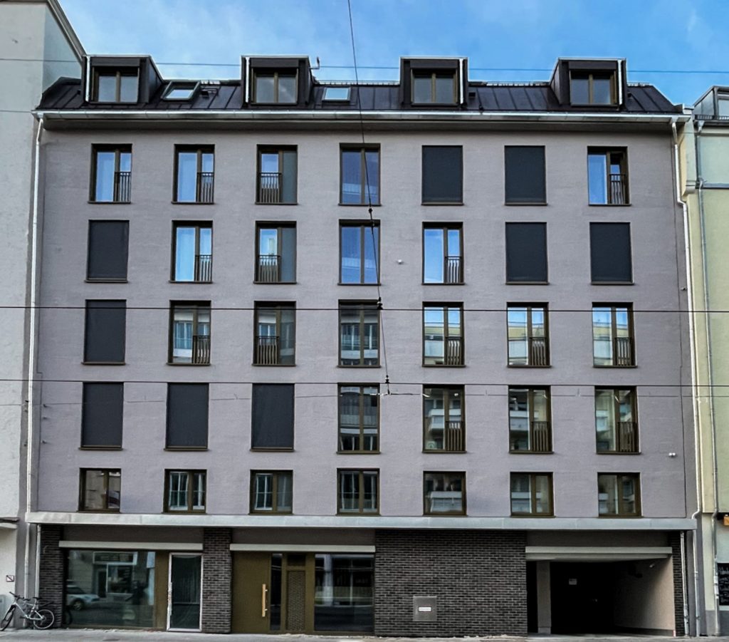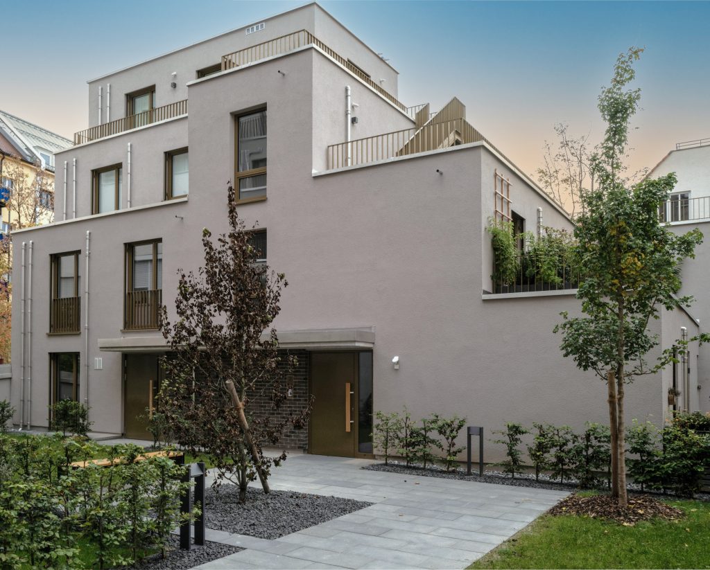 Neunzehn der Wohnungen befinden sich gemeinsam mit einer Ladeneinheit im Vorderhaus, fünf im Hofhaus. Verbunden ist das Ensemble durch einen Innenhof, der den Bewohnern inmitten des großstädtischen Szeneviertels eine ruhige, grüne Oase bietet. Die Ausrichtung nach Süden, zum Hof, schenkt Licht, Sonne und attraktive Balkone, Loggien oder Terrassen.