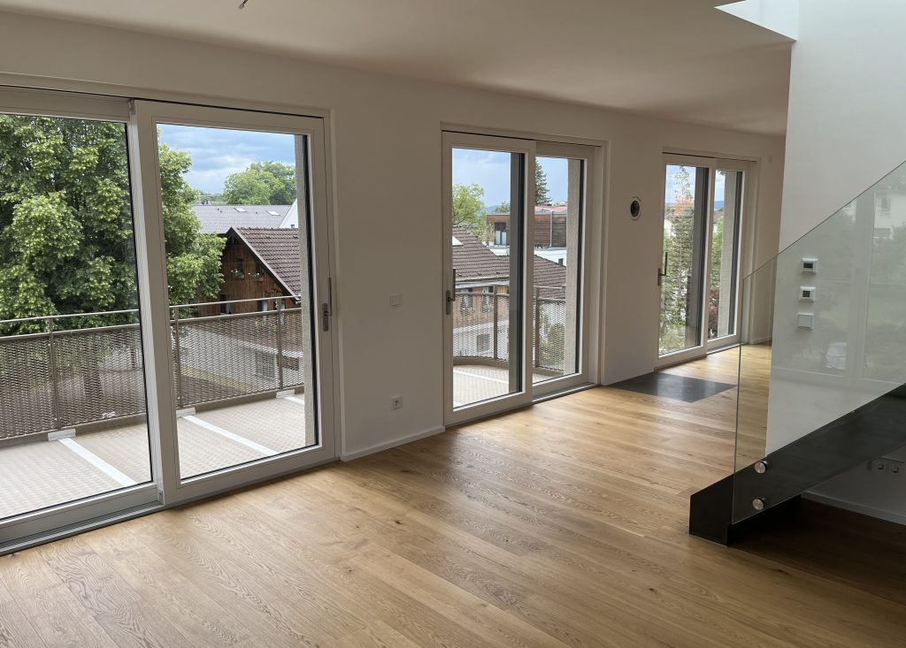 Raumhöhen von bis zu 2,80m und große Fenster schaffen ein großartiges Raumgefühl. Von der Rooftop-Terrasse der Penthaus-Wohnung genießt man einen unverbaubaren Blick auf den Ammersee und die Berge.