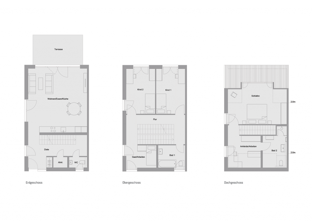 Große Kinderzimmer mit viel Licht, ein eigenes Tageslichtbad und ein separates Spiel-, Gäste- oder Arbeitszimmer. Die Eltern haben ihren eigenständigen Bereich im Dachgeschoss mit Masterbad und Ankleide.